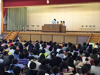 今年度の児童会役員から,新児童会役員にメッセージとタスキを渡しました。
