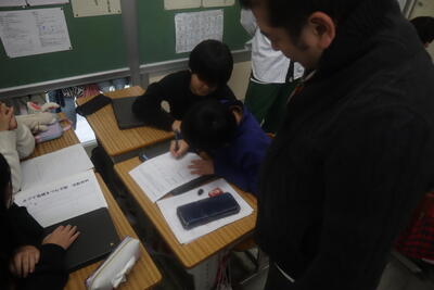 そして、校内ではあるグループが先生に見守られ、電話で質問をしていました。