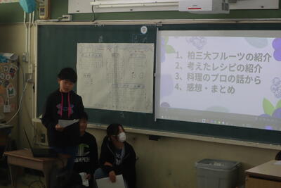 5年生は柏三大野菜や柏三大フルーツを中心に地産地消について学び、活動してきたことの報告会。