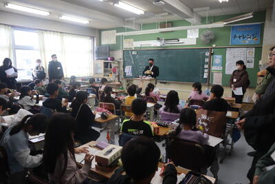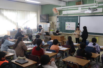 9日は4年生。1学期にお話を聞いた「大堀川の水辺をきれいにする会」のみなさん、2学期にごみと資源の違いを教えていただきゴミ箱作りのアドバイスをもらった廃棄物処理事業所の丸井さん、校内ビオトープ「でんでん村」で自然観察会を行っていただいた柄沢さん、川瀬さん、に見ていただき感想もいただきました。