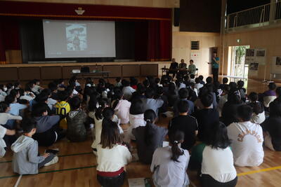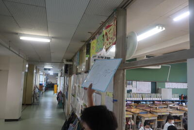 休憩の後、1年生からはクイズと合唱「にじ」。右の書き順を教えて~!