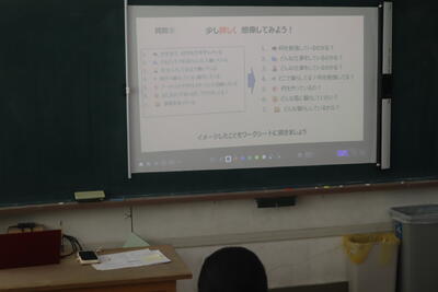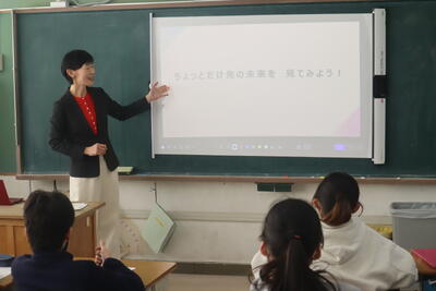 今日はキャリア教育1時間目のゲストティーチャー間野さんが再び登場。間野さんと一緒に「ちょっと先の未来」を考えました。