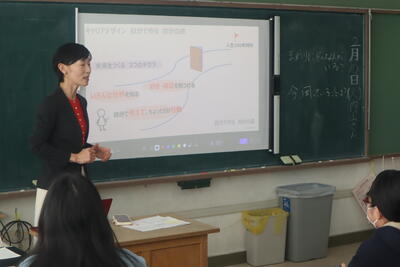 変わったことや変わっていないことも確認し、間野さんからは自分の生きる道は、自分を大切にして(いいところも悪いところも)、自分で決めることが大切というお話がありました。これまでの成長の記録である「キャリアパスポート」を活用して、自分の成長や努力に目を向けることができました。次回はメンタルトレーナーと自分の良さや強みを発見する授業です。間野さんとは再び第3時でお会いします。
