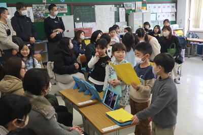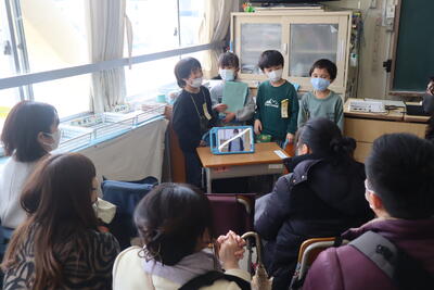 9日は4年生。1学期にお話を聞いた「大堀川の水辺をきれいにする会」のみなさん、2学期にごみと資源の違いを教えていただきゴミ箱作りのアドバイスをもらった廃棄物処理事業所の丸井さん、校内ビオトープ「でんでん村」で自然観察会を行っていただいた柄沢さん、川瀬さん、に見ていただき感想もいただきました。