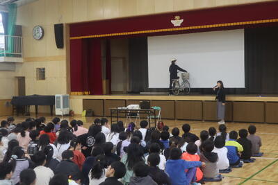 低中高学年にわかれて、防災安全課の方を招いて交通安全教室を行いました。