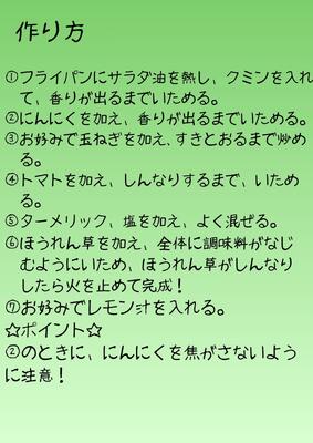 シャキシャキとしたほうれん草の食感と、スパイスの香りが楽しめる料理です。