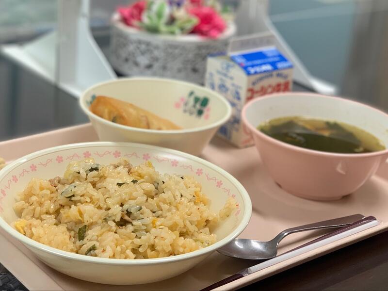 #不定期開催#本日の給食2022#キムチチャーハン#ツナとチーズの春巻き#うずらの卵とわかめのスープ#ふくふく豆#春巻きの食感#新感覚です#レシピを知りたい方は#栄養教諭まで