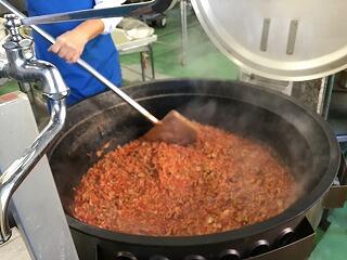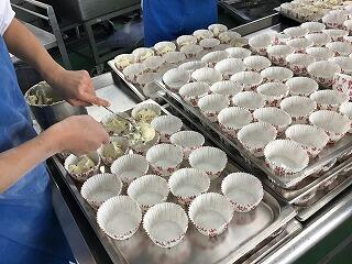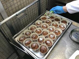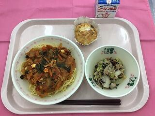 2学期給食最終日はクリスマス献立です。スパゲティはクリスマスカラーの赤,緑を使ったソース,星型のチーズも散りばめました。チョコチップマフィンの生地はホットケーキミックス粉と米粉です。外はサクサク,中はふんわりのマフィンです。