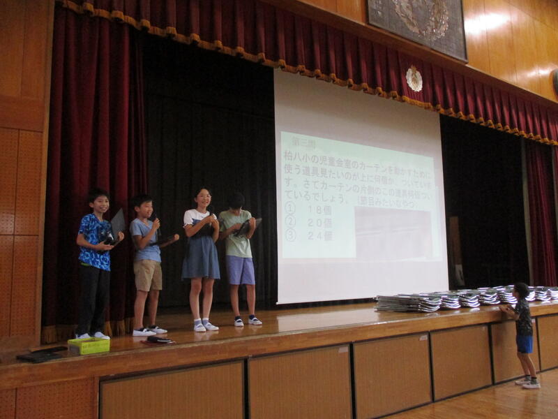児童会の子どもたちは「55周年」にちなんで,柏八小に関係のある内容で全ての問題を作りました。