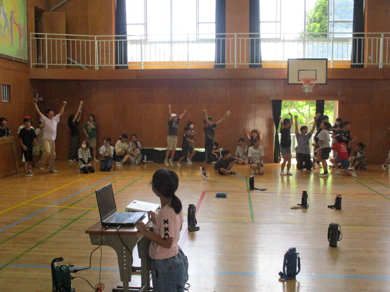 午後のプログラムは、「絆でつかめ、林間王!」。体育館での大レクリエーション大会です。
