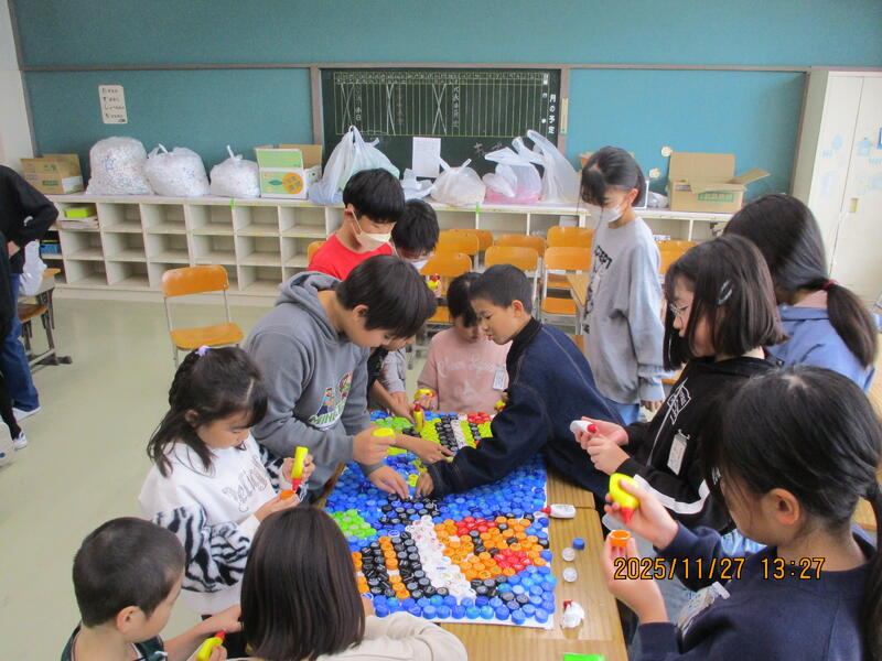 各クラスから集まった代表の子どもたちが,台紙にキャップを貼り付けていきます。