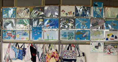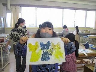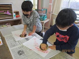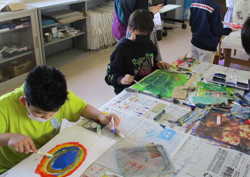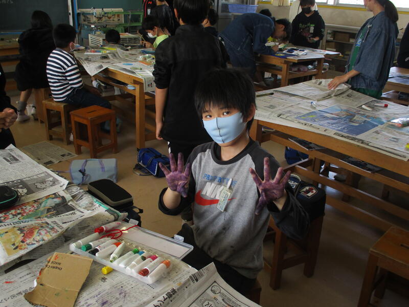 図工室では,3年生が版画の印刷中でした。紙や色々な材料で作った版画版を,カラフルなインクで刷っていました。色も構図もステキですね!