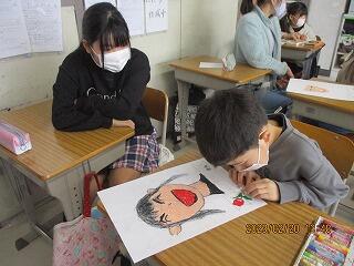 今日は,その絵を描く日です。1年間お世話になったペアの6年生の似顔絵を描きました。