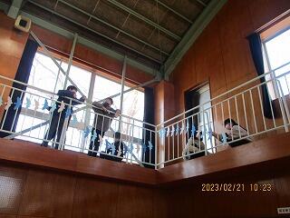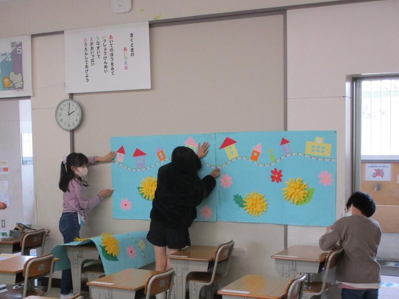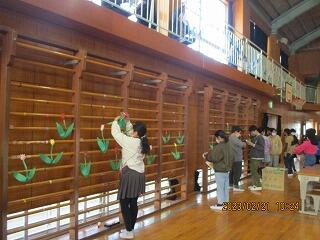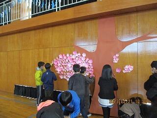 体育館では,5年生が会場の装飾をしていました。桜の花や,飛びたっていく鳥たちをていねいに貼っていきます。