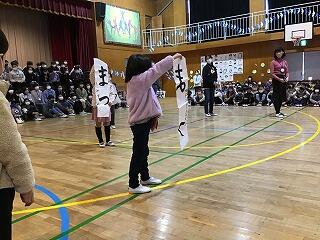 1年生は,お世話になった6年生に「挑戦!」しました。習字や大繩や大声(笑)で6年生と競い,やっぱり6年生はすごい!と実感。さいごは,元気なかわいい歌声でエールを送りました。