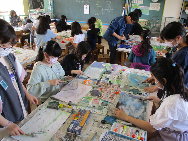 モデルさんを前にして描くって難しいし,何となく恥ずかしいし・・・大好きなお兄さんお姉さんを目の前にして戸惑っている1年生もいましたが,6年生が優しく上手に声掛けをしたり,描き方のアドバイスをしたりして,和やかな交流の時間となりました。