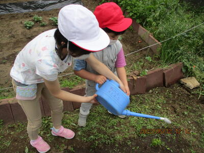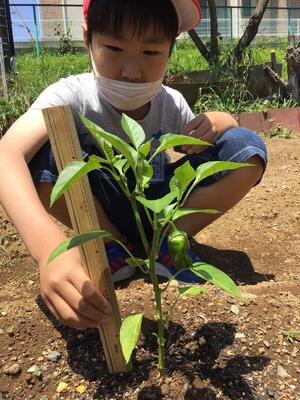 子ども達は畑作り,種や苗植え,水やり,雑草ぬき,石とりなどの畑仕事をしながら,日々野菜の成長を観察しています。