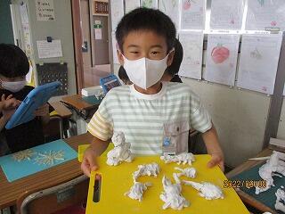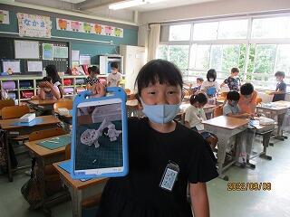 お隣のクラスでは,図工の学習に活用していました。「夏休みの思い出」というテーマで粘土の作品を作り,iPadで撮影し,映像美術館を作っています。実物を見せ合うこともできます,「ともだち美術館」といえ画像を保存し,後で見合うこともできます。便利ですね♪
