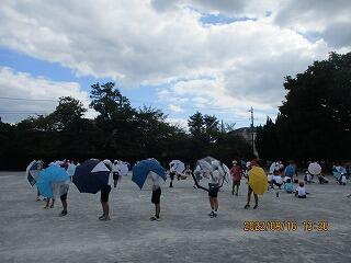 5・6年生のダンスの見どころの一つは「傘」です。本番は,赤・青・黄・緑の4色の傘が美しく舞う予定ですが,手具として使うには耐久性が今一歩で,本番までは自分の傘を使います。素材も大きさも色もそれぞれですが,一生懸命練習しています。傘を持つ場面と,持たずに踊る場面の違いも見どころです。