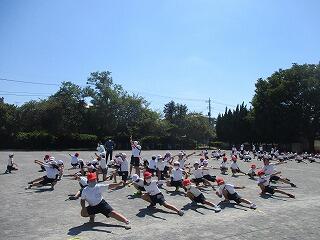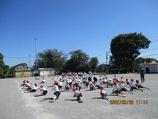 中学年も校庭全体を使っての練習です。ひとりひとりの「エイサー」の素晴らしさが,広い校庭いっぱうに広がりました。丸くなる体形も,とても美しいです。