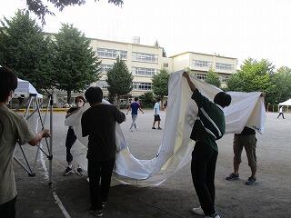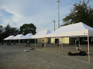 近隣の学校からもお借りして,軽くて設営が簡単なタイプのテントが12張り揃いました。