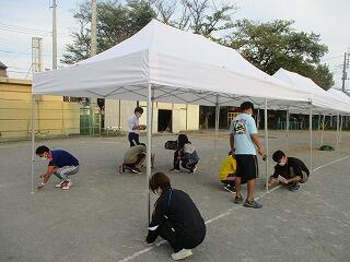 明日の全校練習に備え,教職員で本部テントの他に,決勝審判・用具・児童席の合計12張りのテントを設営しました。
