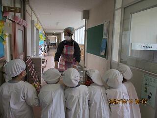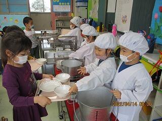 当番さんが身支度をし,ワゴンを配膳室から教室に運び,全員に配膳します。当番さんは1週間ごとに交代です。