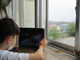5年生の廊下を通ると,何やら外の映像を撮っています。理科の学習で,雲の動きを観察するために,同じアングルで空の定点観測をし,記録していました。