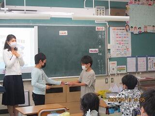 それでも,やっぱり初めての授業にドキドキわくわくです。外国語活動の授業は,担任の先生とALTの先生の2人で進めます。第1回目の今日は,英語で自分の名前を伝えながら名刺を交換するという内容でした。緊張しながらも笑顔で自己紹介をがんばっていました。
