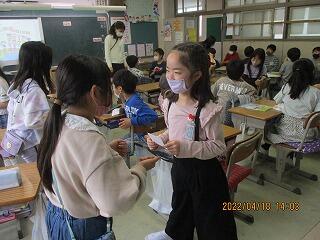 4年生は八小のおすすめポイント紹介したを絵,5年生は素敵なメダル,6年生は名刺&一緒に遊べるパスポートをプレゼントしました。
