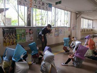 19日の朝,地震がありました。2~6年生は,一昨年も昨年も,揺れを感じたら瞬時に机の下にもぐるという第1次避難を繰り返し練習してきたので,黙って素早く行動できました。1年生は,初めてのことに困惑した児童もいましたが,とてもいい機会なので,さっそく座布団として使っていた防災頭巾の使い方と避難の仕方を練習しました。