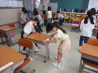 1年生は,お掃除の練習をしていました。今までは,6年生が1年生の教室や廊下を掃除してくれていましたが,いよいよ自分たちでお掃除をします。ほうきの掃き方はや,モップのかけ方,机の運び方などを先生と練習しました。