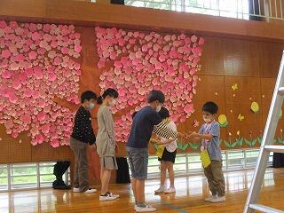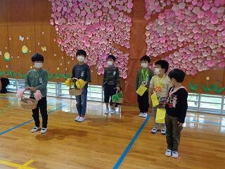 2年生は1年生の時育てたアサガオの種のプレゼント,3年生は今日の会の招待状。