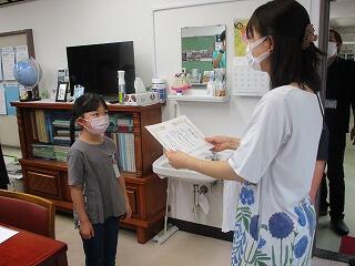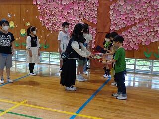 昨年と一昨年は,1年生の代表児童が,各学年の代表児童からプレゼントを受けとり,その場面を映像で全教室に配信するという方法で実施しました。