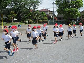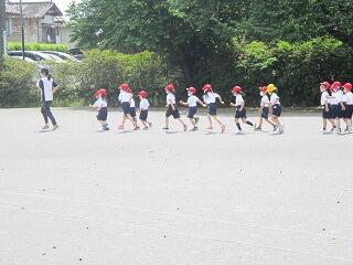 校庭に,かるがもの行進が・・・ではなく,1年生が担任の先生について,トラックを走る練習をしていました。