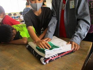 5年生は,5月の林間学校に向けての準備です。宿泊する「少年自然の家」では,帰る前に,使ったベッドの寝具の「厳しい」点検があります。布団と毛布のたたみ方と重ね方が難しい!映像を見ながらバスタオルで練習です。