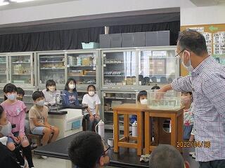 そこで,理科室の中央の机を実験台にして,理科教育支援員の加藤先生が演示実験をしてくださいました。