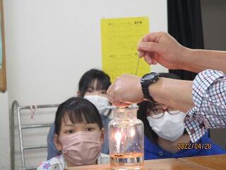 水上置換法で集めた3種類の気体の中での燃え方の実験に目を輝かせていました。