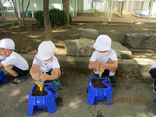 3年生をもう一つ。大きく成長し,枯れた花の後に種がびっしりのヒマワリを観察しました。なんと草丈は2m50cmでした!葉っぱは3年生の顔よりも大きくて,手のひらを重ねながら「大きいねえ」と感心していました。