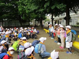 1学期の避難訓練は,地震を想定したものでしたが,2回目の今日は地震後に給食室から火災が発生したという想定で行いました。ですので,給食室を避けるため避難経路が変わります。少し遠回りなったクラスもありましたが,混乱なく「お(さない)・す(すばやく)・し(ゃべらない)・も(どらない)」の約束も守って避難できました。