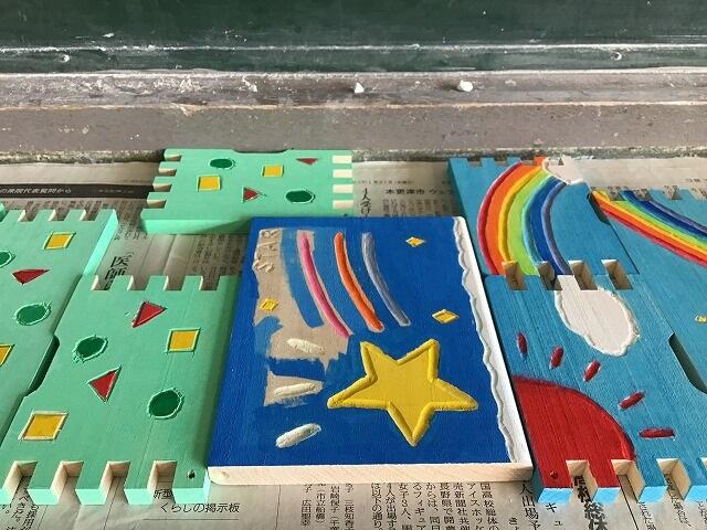 まわりの板を彫刻刀で彫ります。 絵の具で色をつけています。