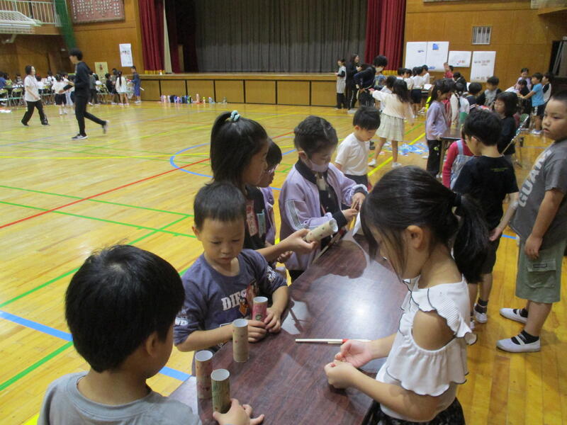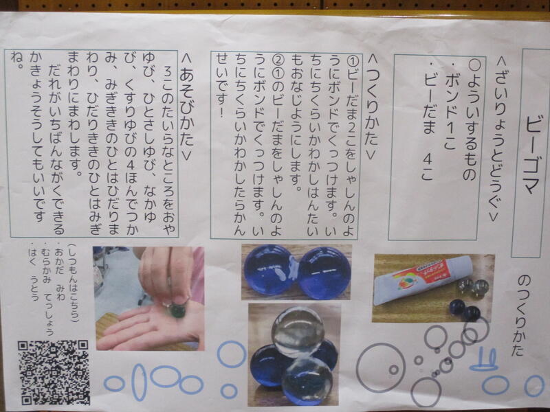 〇説明書を1年生でも読めるように,全部ひらがなとカタカナで書いたり,QRコードを(説明書に)付けたりして工夫しました。おもちゃの遊び方をかんたんなものにしました,1年生が来てくれてうれしかったです。「空気でっぽう,楽しかったよ。」と言ってくれていたことがとってもうれしかったです。わたしはとっても楽しかったです。