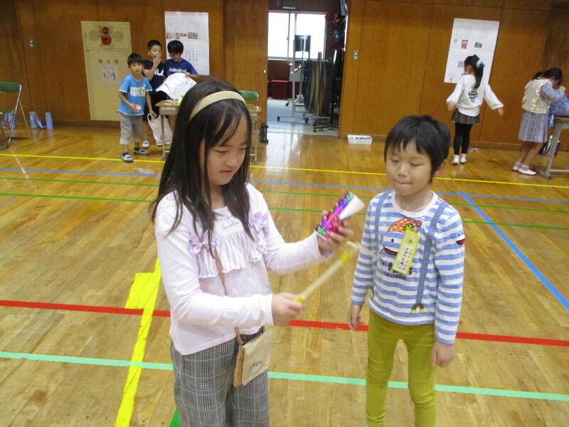 〇お店屋さんで,看板を見えやすく,頭の上にしっかりあげて,1年生に見せました。おもちゃは,どんな組み合わせを使ってやるかを机の上に置いて,見やすくしました。いろいろな1年生が楽しく遊んでくれて,うれしかったです。