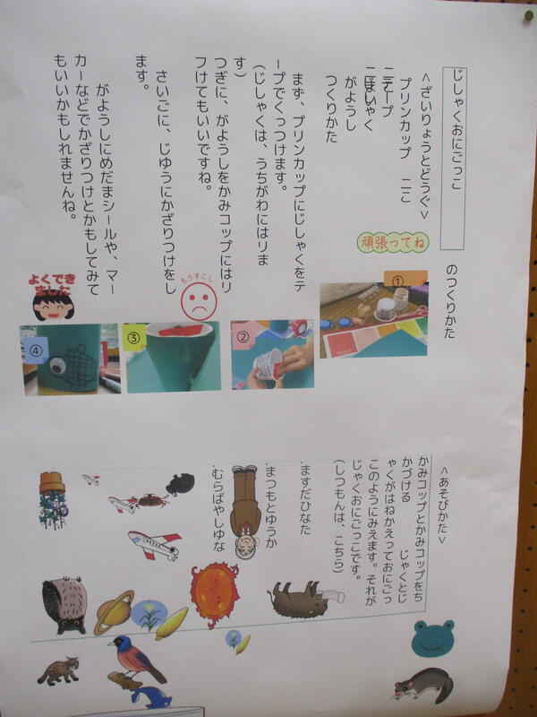 〇「紙コップお化け」は,「息をかけてうく遊び」なので,いっぱい押さえられるようにテープではったのも工夫です。説明書は,「①」とかを書いて,道具や材料の写真もきれいに並べてとりました。1年生が「楽しい」と言ってくれてとってもうれしかったです。