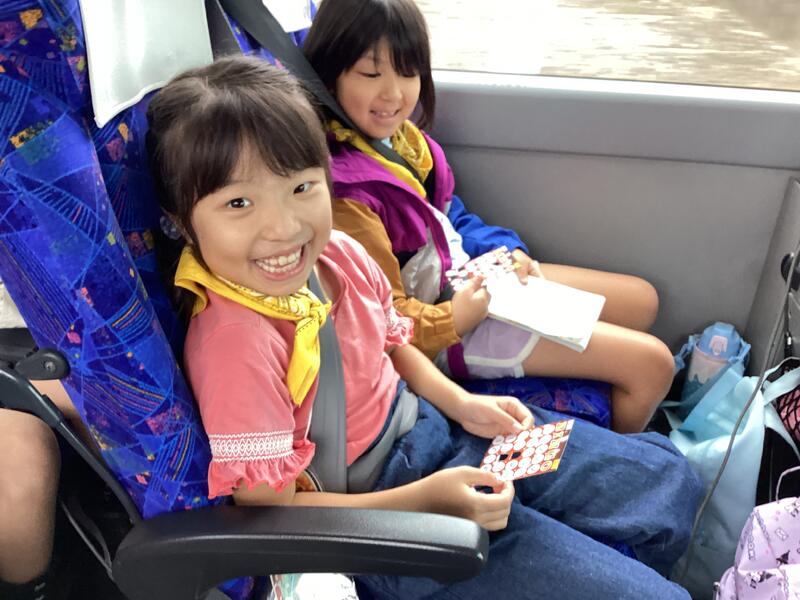 さて,バスに乗ってからは,係の子どもたちが考え用意してきた,バスレクの時間が始まります。