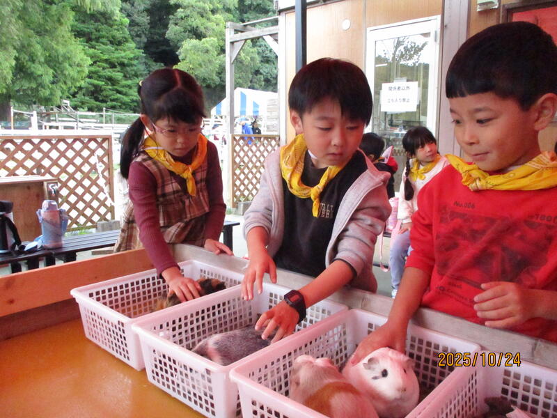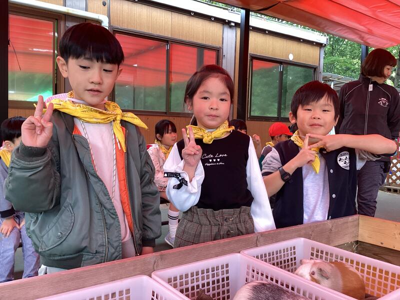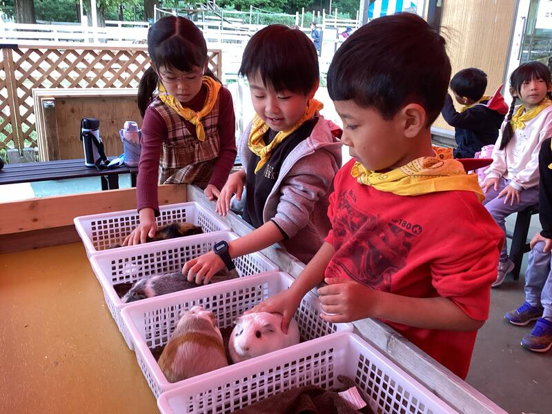 この日,早起きしている子どもたち。園内を見学し,動物ともふれあい,もうお腹はペコペコです。