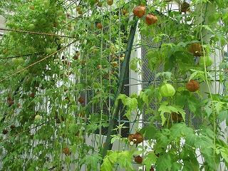 4年生が育てている「ツルレイシ」は,緑のカーテンになり実をつけています。
