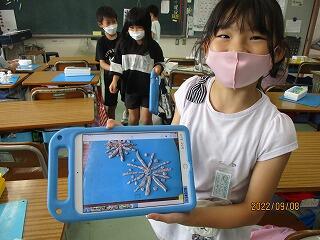 お隣のクラスでは,図工の学習に活用していました。「夏休みの思い出」というテーマで粘土の作品を作り,iPadで撮影し,映像美術館を作っています。実物を見せ合うこともできます,「ともだち美術館」といえ画像を保存し,後で見合うこともできます。便利ですね♪