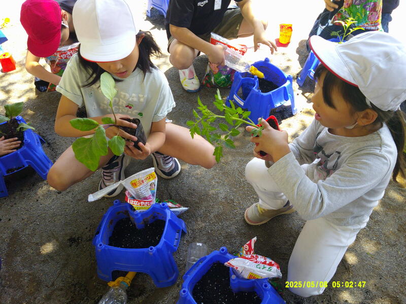 「早くナスがならないかなあ。」とつぶやきながら,苗植え後の水やりに精を出す子もいました。