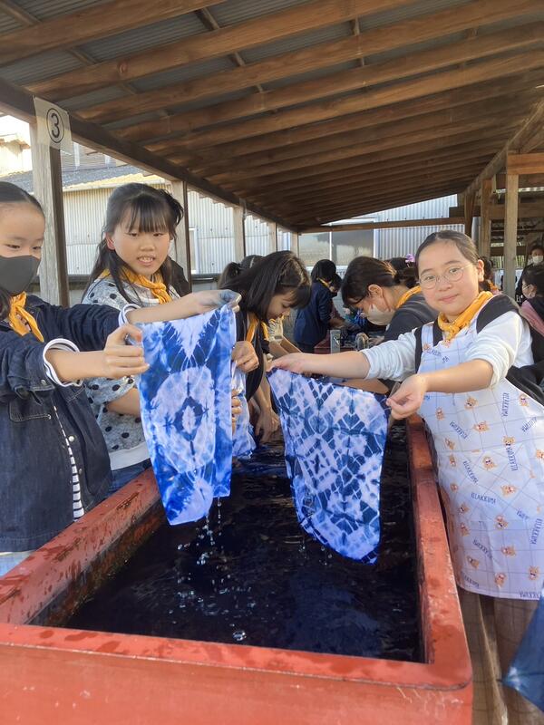 ゆっくりと染料に浸し、輪ゴムを取り、水洗いすれば完成。作品を見た時の子どもたちの嬉しそうな表情、お見せしたかったです。